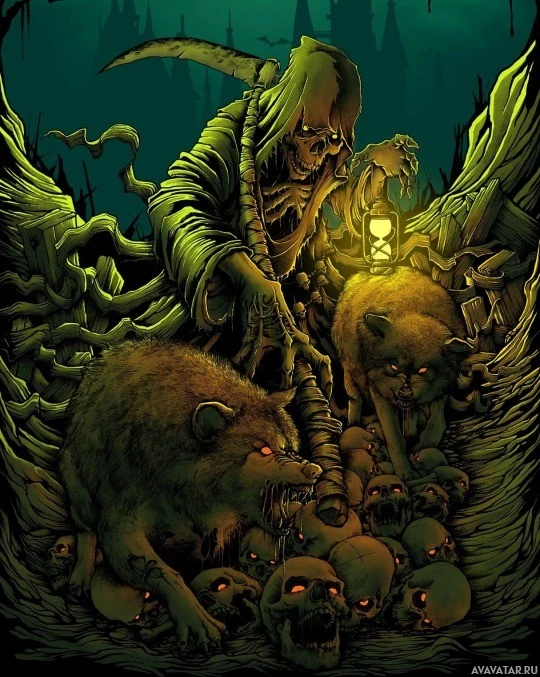 several skulls around the scene, both on the ground and held by the creature itself, further emphasizing the macabre nature of the image. 4. The presence of a wolf, or more specifically a werewolf, is another common element in supernatural or