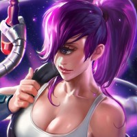 mechanical parts on her arm. Her expression is serious, and she's holding what looks like a weapon or tool in her left hand. The background is dark and features a glowing purple