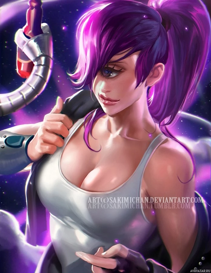 purple hair and a futuristic style. She is wearing a sleek silver outfit with a high neckline and has