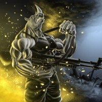 battle gear, and holding what seems to be a weapon in one hand while making an angry expression. The background suggests a chaotic or war-like environment with smoke or explosions around him, which fits the character's