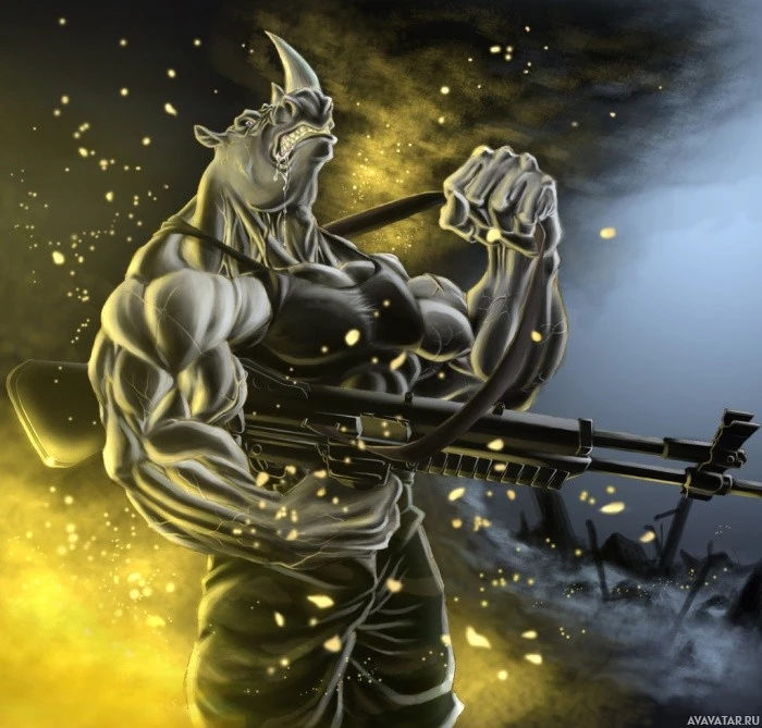 The image shows an illustrated character that appears to be Rocksteady from the "Ratchet & Clank"
