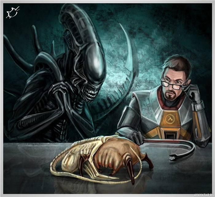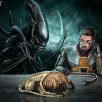 Gordon Freeman from "Half-Life." Between them sits an object that looks like a dead