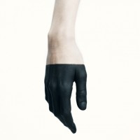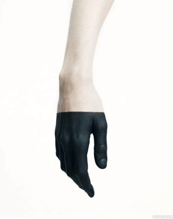 black gloves. The hand is facing upwards, and the gloves appear to be made of a material that could be leather or rubber. There is also
