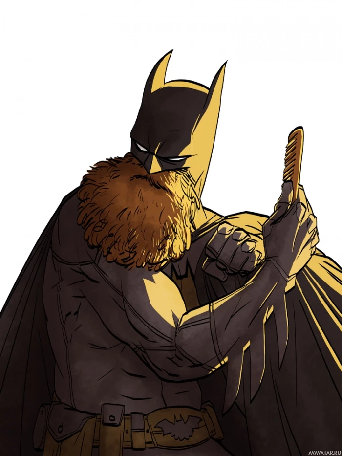 book character, Batman. He is depicted in a somewhat humorous manner, with a large beard and mustache that adds