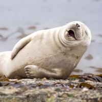 a rocky beach. It appears to be enjoying its time, possibly laughing or smiling with its mouth open, which is quite amusing and human-like in nature. Seals are often found near coastal areas where they can find food such as fish and other