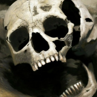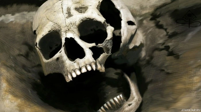 human skulls. One is fully visible and intact, while the other appears to be broken or damaged on one side, showing a darker area where part of