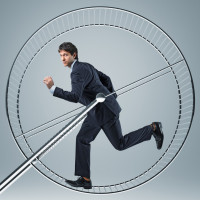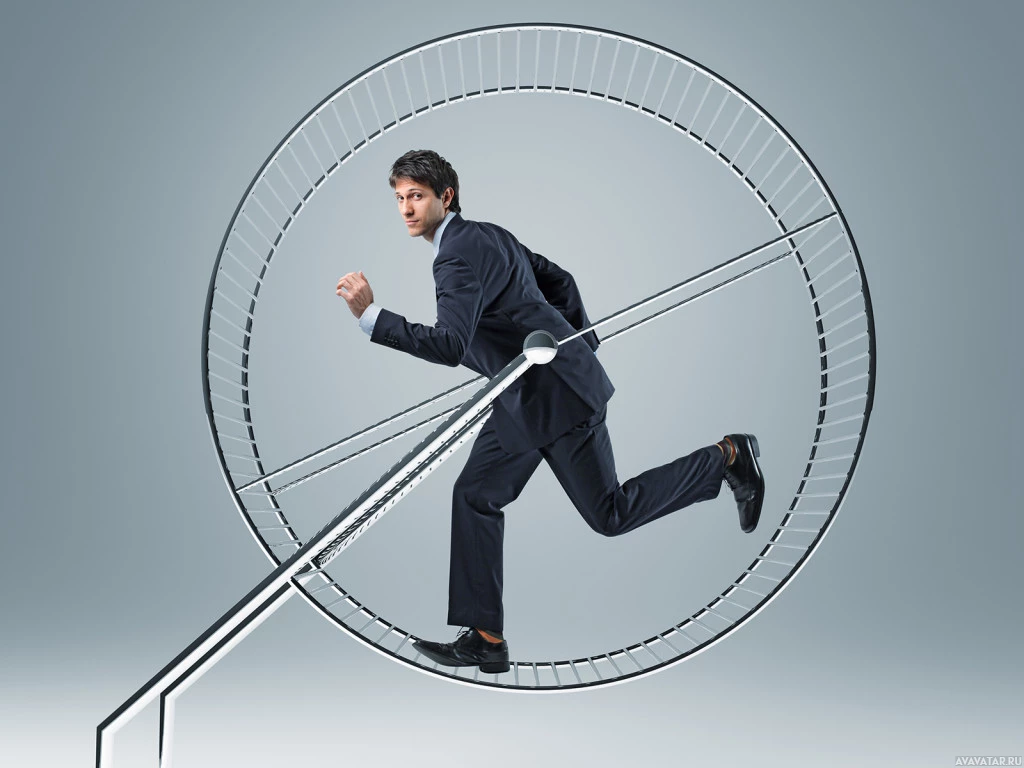 business attire who appears to be running towards an apparatus that resembles a large fan or blow dryer. The background is neutral-toned and gives off the impression of being in