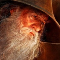 The image depicts a figure that resembles Gandalf from J.R.R. Tolkien's Middle-earth fantasy universe. This character is known for his long white beard and pointed hat, which are prominent features in the image. It appears to be an oil painting with a realistic style, capturing the depth of expression on the character's face.