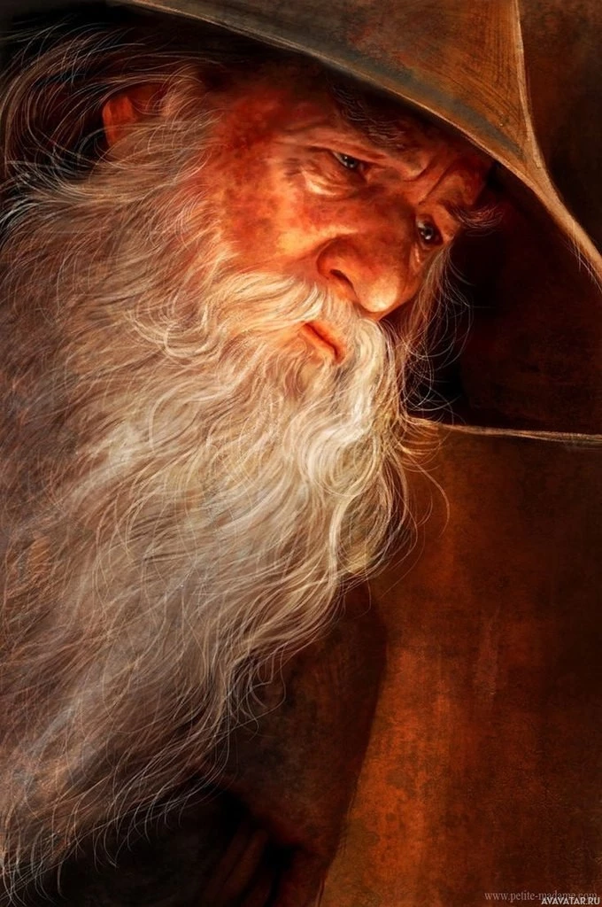 На картинке изображена фигура, напоминающая Гэндальфа из фантастической вселенной Дж.Р.Р. Толкина. Этот персонаж известен своей длинной белой бородой и остроконечной шляпой, которые являются заметными чертами в изображении. Это масляная картина с реалистичным стилем, отражающая глубину выражения лица персонажа.
