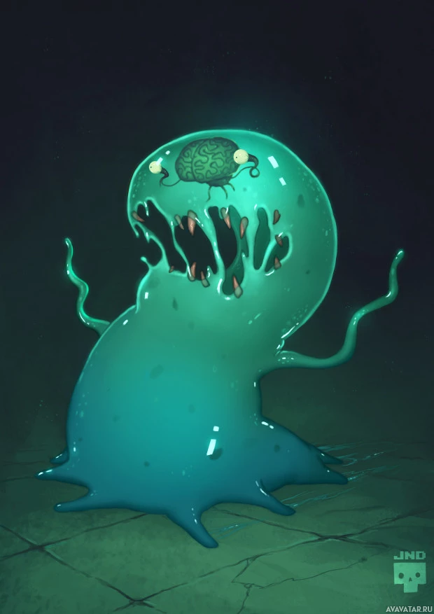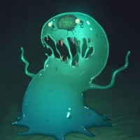 a fantastical creature that resembles a monster with tentacles. It has a glowing green body and is holding its head up, which appears to be separate from the rest of its body due to