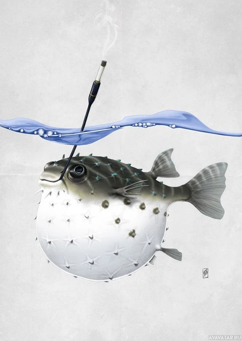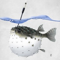 a cartoonish fish with a large, inflated body that resembles a buoy. It has a blue fin on its back and is equipped with what appears to be an underwater