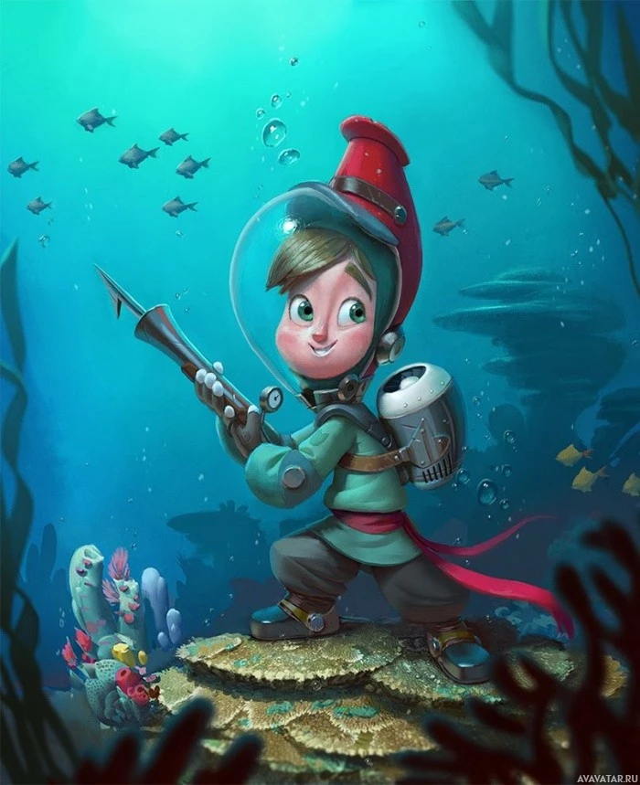 an animated character wearing a diving suit and helmet, indicating they are underwater. They have goggles on their eyes and are holding what appears to be