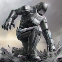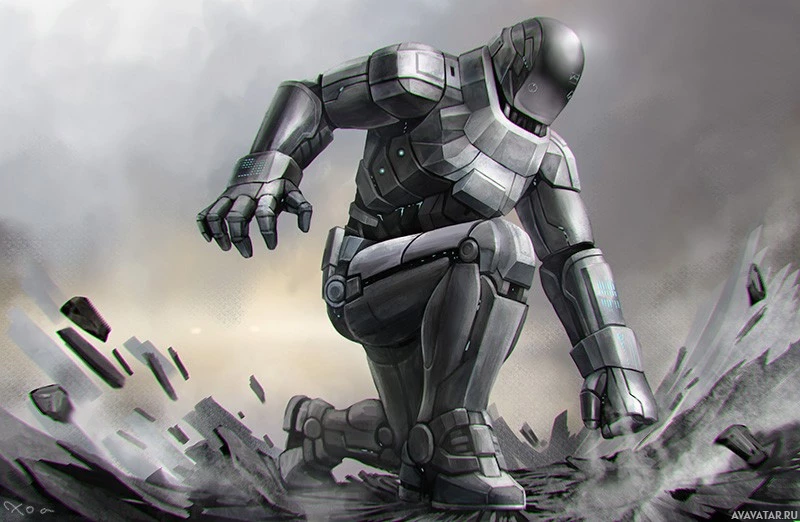 The image depicts a robot, which appears to be designed for some form of combat or battle. It has a humanoid shape with a bulky exoskeleton and is shown in