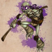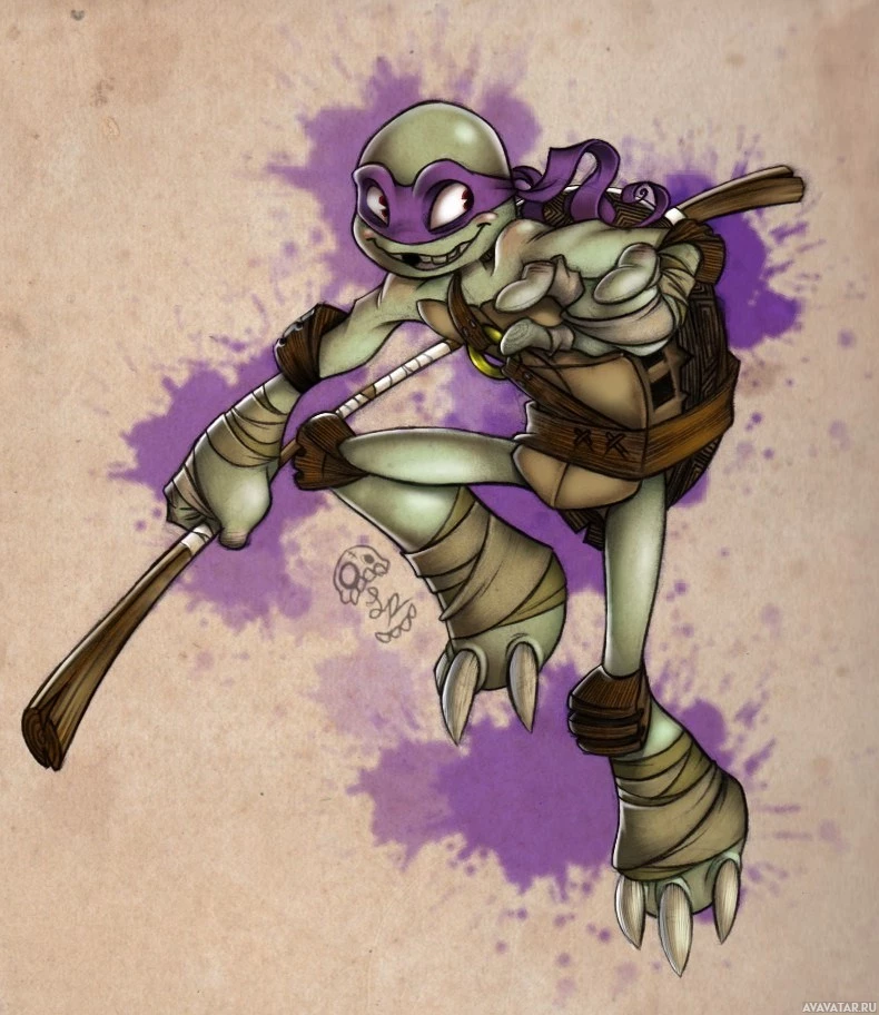The image depicts an illustration of Donatello, one of the Teenage Mutant