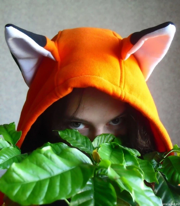a foxy character. The person is partially hidden behind some foliage, with only their face and part of their outfit visible. It seems like they are playfully hiding or peeking out from the leaves in a fun and