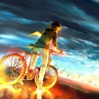 The image depicts a girl riding a bicycle from behind. She appears to be moving at a rapid pace, as suggested by the motion blur effect and