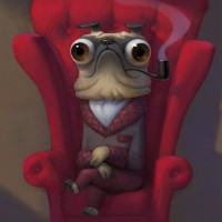 a red chair, smoking a pipe. The dog is wearing what appears to be