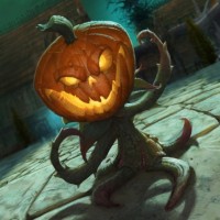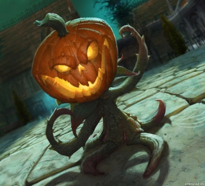 The image depicts a creature with the head of a jack-o'-lantern, which is traditionally associated with Halloween. This creature appears to be a fantasy or whimsical representation, blending elements of a pumpkin and possibly a creature resembling a squid or octopus, given its tentacles. The setting suggests it might be in a Halloween-themed environment, possibly during the nighttime due to