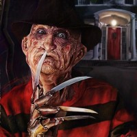 Freddy Krueger from the "Nightmare on Elm Street" series of movies. He is holding a pair of gloves with blades on them, which are iconic to his character's ability to kill in his dream-like world. Behind him stands a sign that reads "ELM ST." The setting appears to be a suburban neighborhood at night, evoking