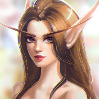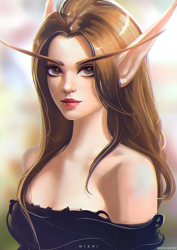 an elven character. She has pointed ears, which is a common characteristic of elves in folklore and fantasy genres. Her hair color ranges from dark to light shades, suggesting it may change depending on the lighting or her mood. The artwork is detailed and vibrant, showcasing the beauty often associated with such