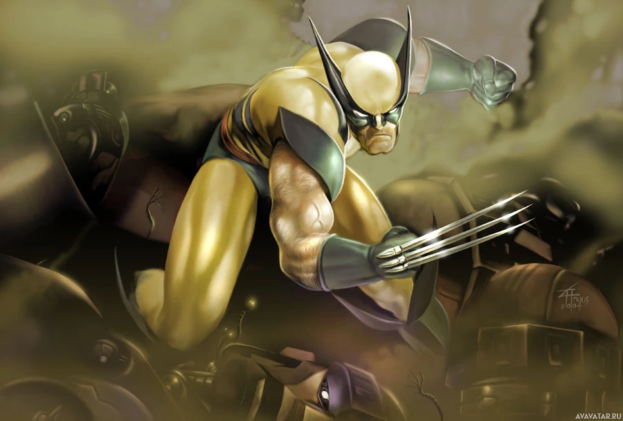 The image depicts two characters, known as the X-Men and Wolverine, engaged in combat. On the left side of the image is a character with