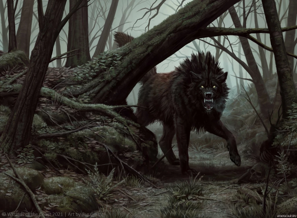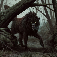 a forest setting. It appears to be an artistic representation of the animal, captured mid-stride with its mouth open as if howling or communicating with others. The forest around it looks misty and overgrown, giving a sense of a wild and somewhat eerie environment.