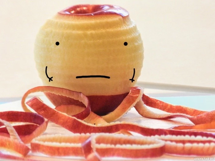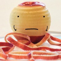 The image shows an apple that has been carved to resemble a face, with a smile and eyes. It appears to be sitting on a plate along with some carrot sticks arranged around it in
