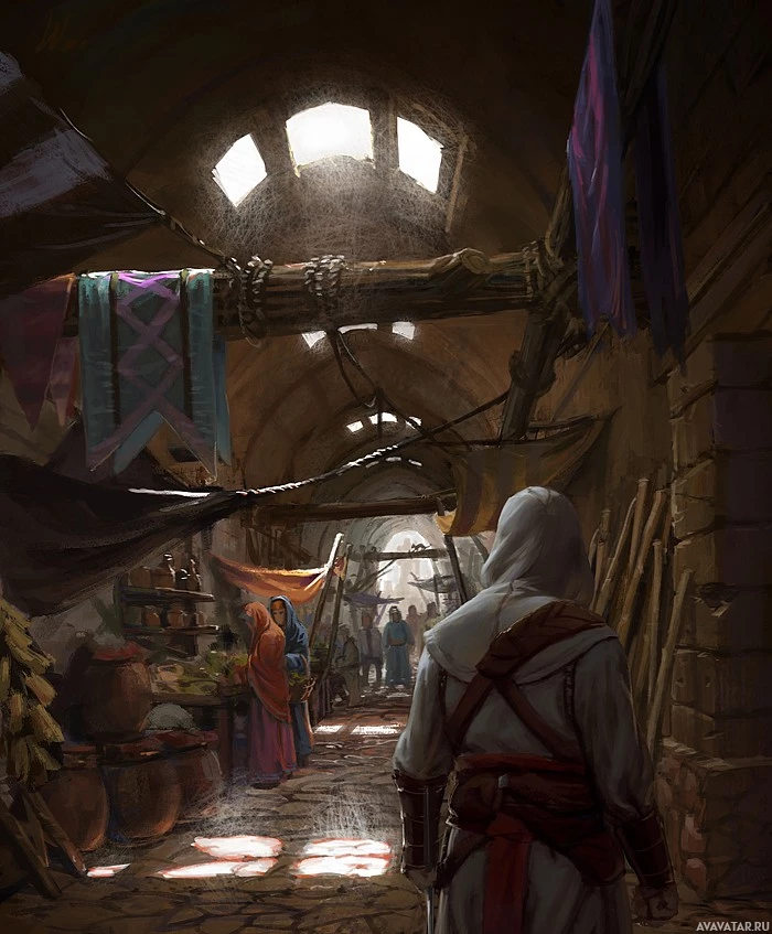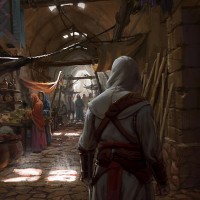 several characters, including one wearing robes with an emblem that looks like the logo of Assassin's Creed. In the background, there are goods and people going about their day, which is typical for a medieval-style market