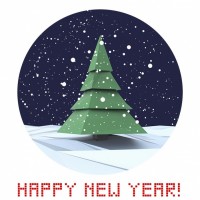 a dark background. The colors used are predominantly green for the tree, blue for the sky, and white for the text and snowflakes, which gives the image a cold
