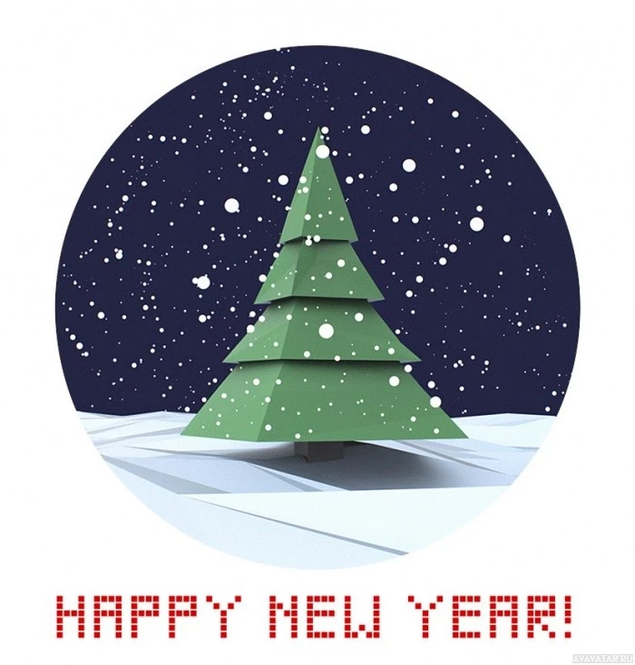 night sky filled with falling snowflakes. This festive scene is centered within a circular frame, and below it, there's a greeting that reads "Happy New Year!" in bold white letters against
