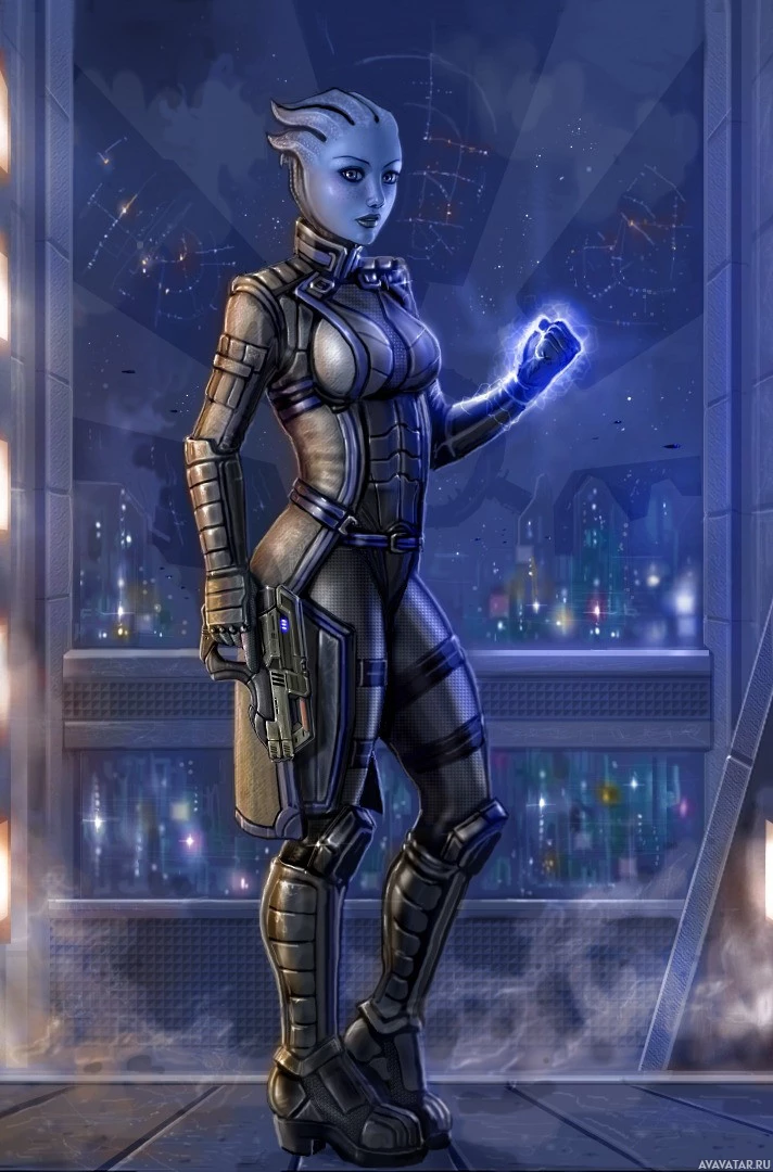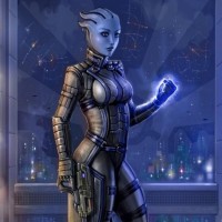 The image depicts a character from the "Mass Effect"