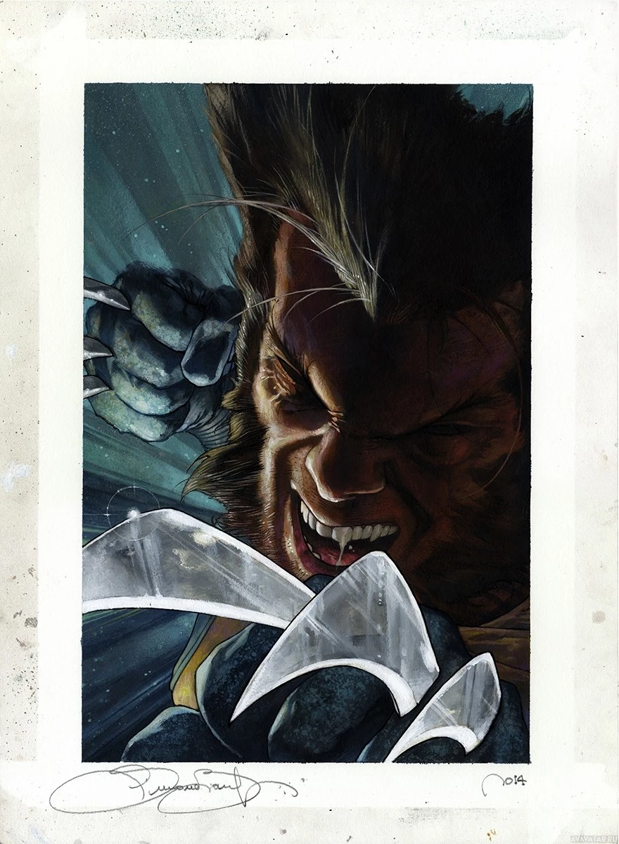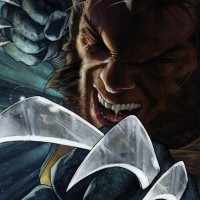 iconic costume, which includes a black tank top and silver armor with pointed claws extending from his hands. His face shows a stern expression, and he has