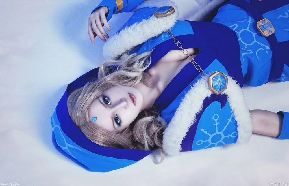 The image features a person dressed in cosplay, emulating the character Crystal Maiden from