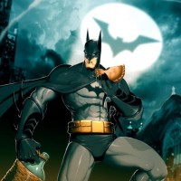 a full moon visible in the background, suggesting that it could be a scene from one of his nocturnal adventures. Batman is holding a large sack of food which seems to contain loaves of bread or similar items, indicating that he might be delivering food to those in need, which is a common