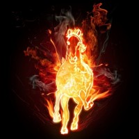 The image shows a horse, which is an animal. However, this is not a typical depiction of a horse because the image is manipulated to make it appear as if the horse is on fire. This creates a surreal or possibly symbolic representation of the animal. The flames are blurred and swirling around the horse, suggesting motion or energy.
