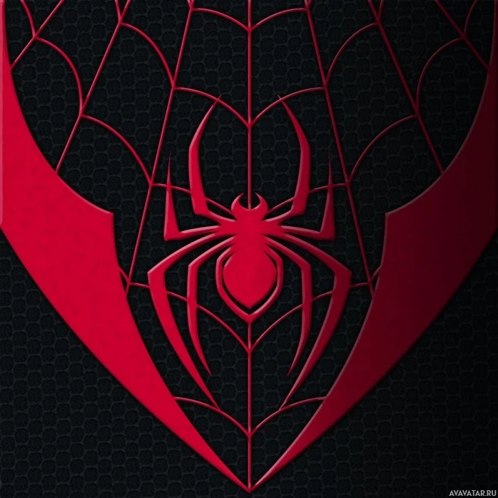 На картинке изображен логотип Человека-паука, который включает в себя стилизованную эмблему паука в центре с красными и черными элементами. Фон имеет темный узор, который может быть вдохновлен перепонками, в соответствии с темой Человека-паука.