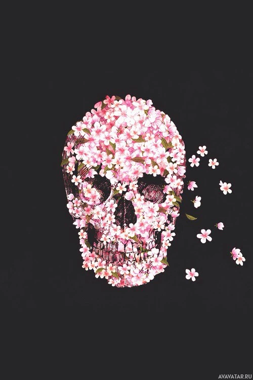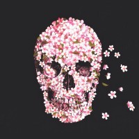 cherry blossoms falling across the frame, which also includes some small white flowers scattered around the lower right corner. The overall effect is artistic and evocative, with the skull representing mortality or
