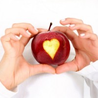 The picture shows a woman holding an apple with a heart drawn on it. She is smiling and appears to be enjoying herself, possibly celebrating or expressing her love for the apple or symbolically representing