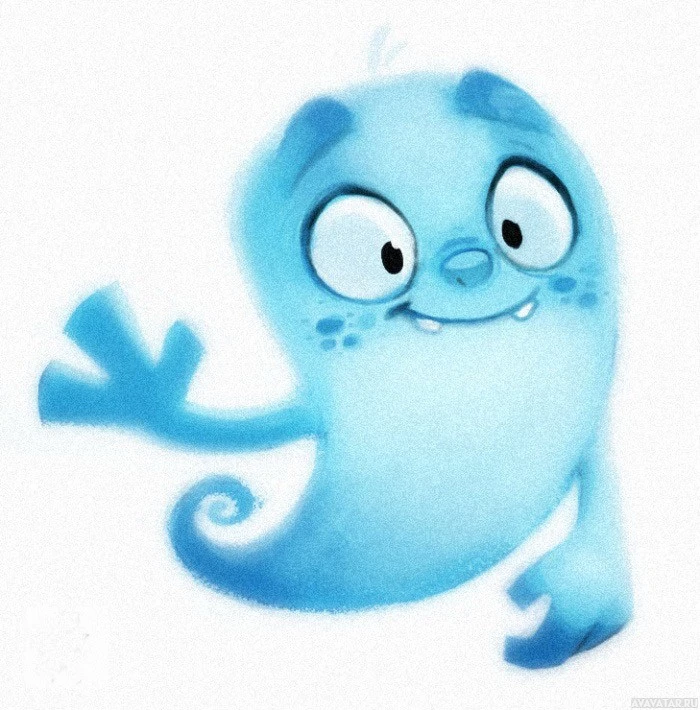 Картинка показывает милого, анимированного персонажа, который напоминает призрака. Это голубое существо с дружелюбным выражением лица и тем, что кажется вьющимся хвостом с правой стороны. Этот персонаж не имеет видимых рук или крыльев, но имеет веселое поведение.