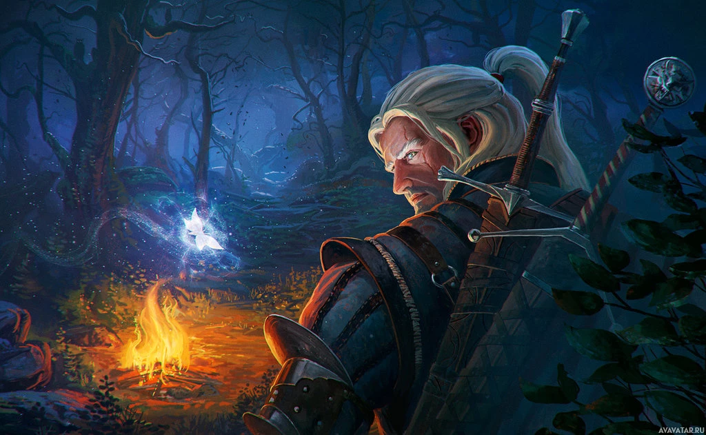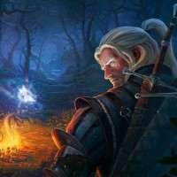 Geralt of Rivia, known as the White Wolf, who is one of the primary protagonists in the series. He is depicted sitting by a campfire with what appears to be a creature resembling a fox beside him. The environment suggests a forested or
