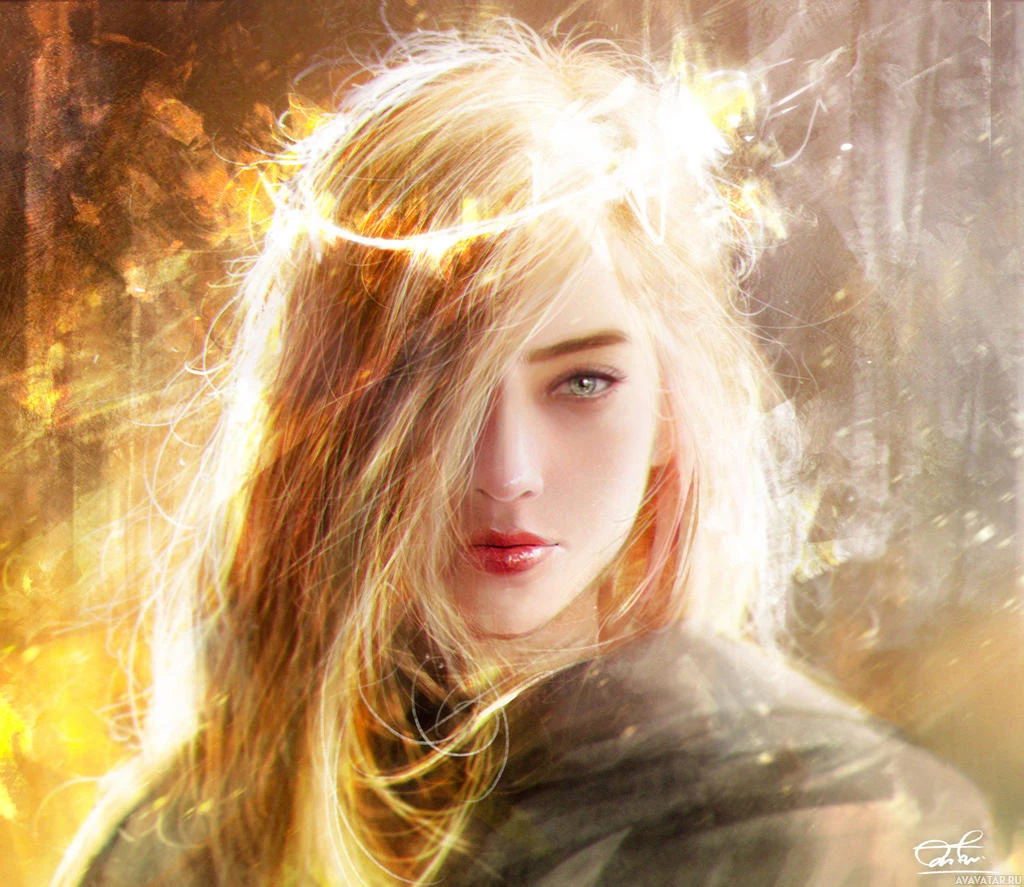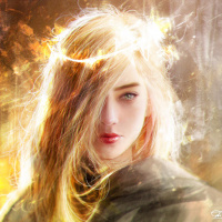 golden light or sparkles, creating a sense of warmth or enchantment around her. There is no text visible in the image.