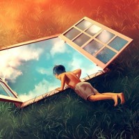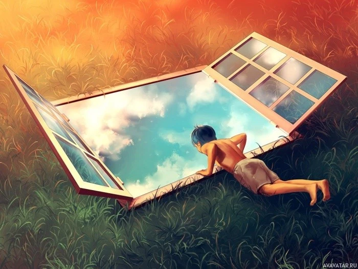 window frame. This creative and artistic representation of a window seems to be a mirror image of reality, as if the viewer is looking into another world or dimension through the window. It's