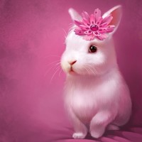 a pink flower, possibly a daisy, on its head. It appears to be wearing the flower as a hat or decoration. The background is a soft
