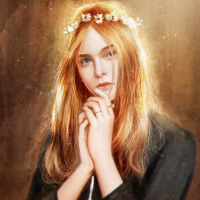 a warm light illuminating the scene from above, giving it an ethereal quality. The overall mood of the image is peaceful and possibly symbolic given the wreath or crown she wears.