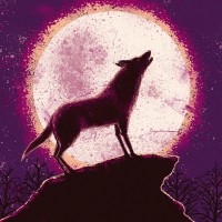 The image features a wolf silhouette standing on what appears to be a rock or an elevated surface under