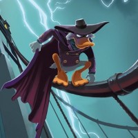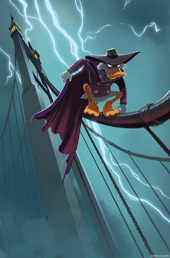 an animated character, likely inspired by the Disney's "Darkwing Duck" series. This character appears to be a detective or superhero duck, as indicated by his cape and fedora-style hat. He is depicted in