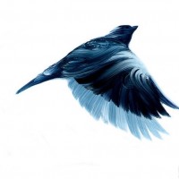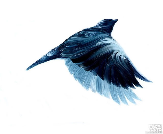 smooth lines and flowing feathers that depict the movement of the bird through the air. The colors are mainly blue and black, giving it a somewhat abstract or impressionistic feel.