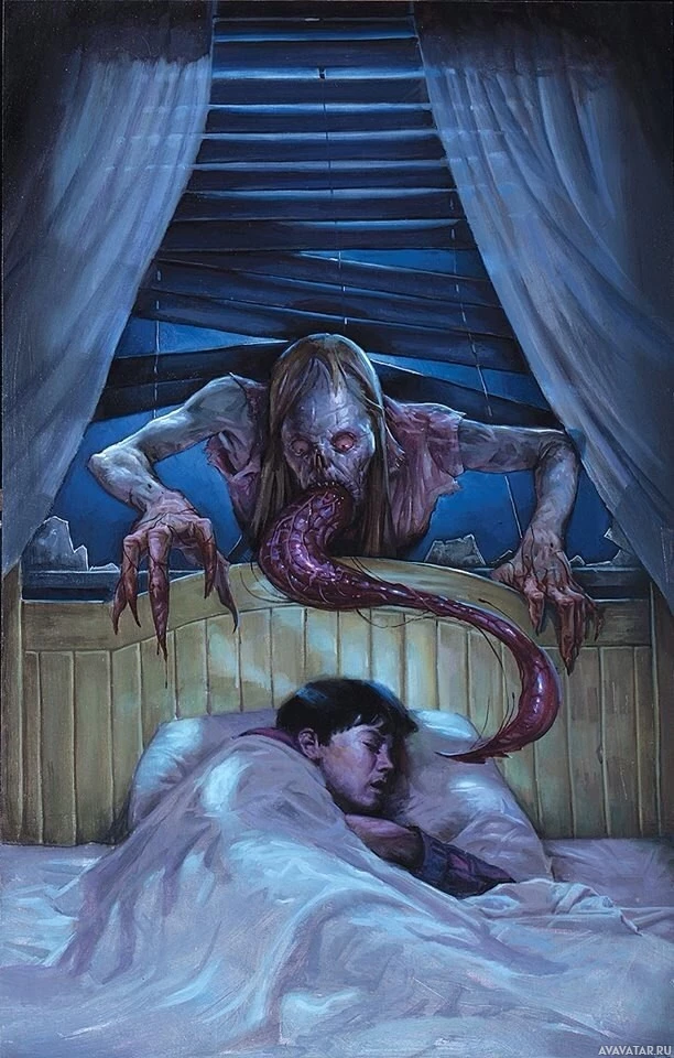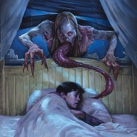 The image shows a painting or illustration depicting a horror theme. It features a figure lying in bed, appearing to be asleep or resting. Above this figure looms an ominous creature with pale skin, long claws, and glowing