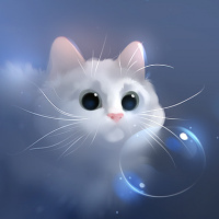 The image shows a stylized illustration of a white cat. The cat has large, expressive eyes and is holding a bubble with its paws. It appears to be in a serene or playful state, possibly floating on the surface of water given the ripple effect beneath it. The background is darker blue, which might suggest an evening or underwater setting.