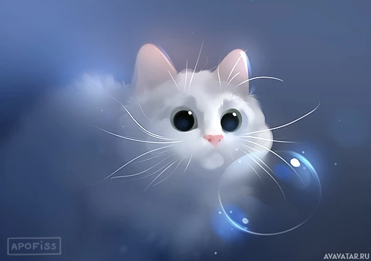 На картинке изображена стилизованная иллюстрация белой кошки. Кошка имеет большие выразительные глаза и держит пузырек лапами. По-видимому, он находится в спокойном или игривом состоянии, возможно, плавая на поверхности воды, учитывая эффект ряби под ней. Фон темно-синий, что может указывать на вечернюю или подводную обстановку.